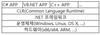 CLR : C#으로 만든 프로그램이 실행되는 환경. CLS(Common Language Specification) 규격을 따르는 모든 언어 프로그램을 지원한다.