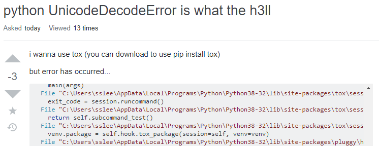 오늘은 UnicodeDecodeError에 대해서 알아보았습니다. 다음 글에서는 tox를 사용하는 방법에 대해서 소개해드리도록 하겠습니다. 감사합니다. 폴더명은 이제부터 꼭 한글말고 영어를 씁시다. 한국어가 만국 공용어가 되기전까지는말입니다. 🤣