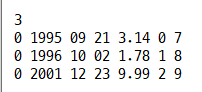 예를 들면 위와 같은 파일입니다. 😮 추측을 한다면 첫 번째 줄의 3은 아래에 나올 데이터 개수인 것을 쉽게 알 수 있습니다. 그 아래 데이터를 보면 맨 앞에는 모두 0인 것을 보아하니 그냥 구분을 위해 0을 쓴 것 같습니다. 이후에는 연도 월 일 순으로 되어있고 뒤에도 어딘가에서 필요한 데이터라고 생각하면 되겠습니다.