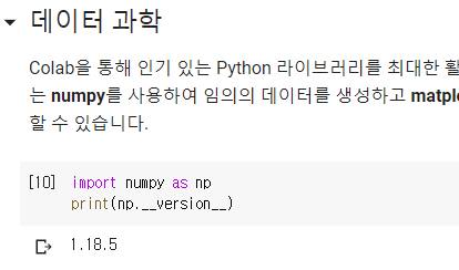 위 코드로 numpy를 포함시키고 버전을 확인합니다. (현 시점에서는 1.18.5 네요)