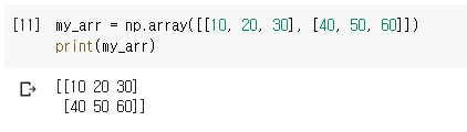 배열을 생성하고 출력해줍니다. (넘파이는 파이썬 배열과 다르게 숫자와 문자열을 같이 담을 수 없습니다.)