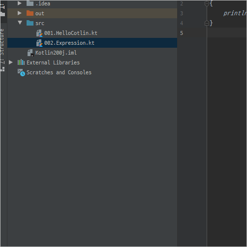위 코드는 실행은 되지만 출력결과는 아무것도 없다. 출력을 통해 확인하고 싶으면 println() 등의 함수를 사용하면된다.