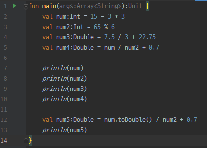 저는 보통 1.0을 곱해주는 방법을 사용합니다. 🌭 하지만 여기서는 num5를 보시면 .toDouble() 이라는 함수를 통해서 Int형을 double 형식으로 변환해준 뒤 연산을 실행했습니다.