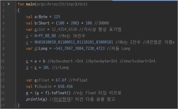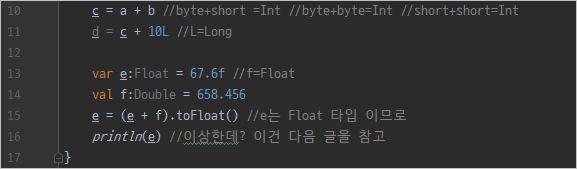15: e + f의 결과의 경우 Double형이 되지만, 현재 대입하려는 e가 Float 타입이므로 .toFloat() 메서드를 사용해서 Float로 변환 후 e에 대입해주는 모습입니다.