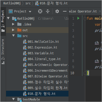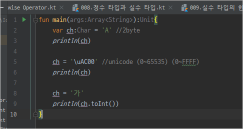 2(번째 줄): ch라는 이름의 Char형 변수를 선언했습니다. 코틀린에서는 문자하나를 저장하기 위해서 Char 타입을 사용하며 그 크기는 2바이트입니다.