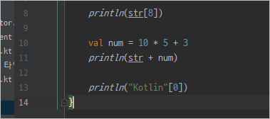 13: Kotlin!이라는 문자의 0번 인덱스에 접근하고 있습니다. 문자열의 시작 인덱스는 1이 아닌 0부터 이므로 [0]은 첫 번째 문자를 꺼내오라는 것과 같습니다. 때문에 결과 또한 K가 출력됩니다.