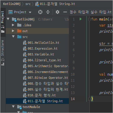 코틀린에서는 String 이라는 키워드로 문자열을 나타내고 큰따옴표("")로 문자열을 감싸서 나타냅니다.