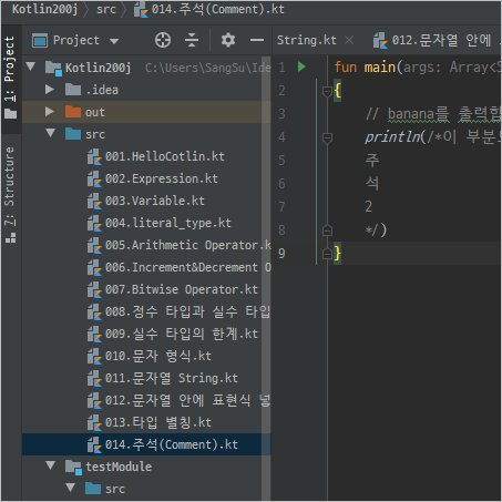 일명 주석이라고도 하며 영어로는 코멘트라고 부릅니다. 사실 코틀린의 주석다는 방법은 자바와 동일합니다. 슬래시 두개로 다는 방법과 슬래시와 별표시로 여러줄 주석을 다는 것을 지원합니다. 아래 코드에서 확인하세요.