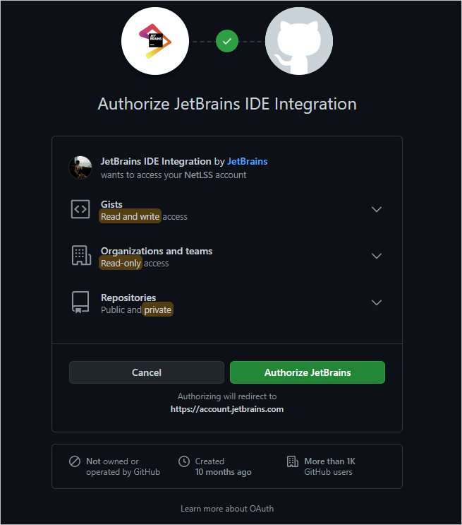 그리고 깃허브 로그인을 하게되면 위와 같이 인증을 하는 화면이 뜨는데 Authorize JetBrains 버튼을 눌러서 인증을 완료하시면 되겠습니다.