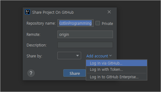 Remote는 기본값인 origin으로 두고 Add account에서 Log in via GitHub를 통해 깃허브 로그인을 해줍니다. 깃허브 계정이 없으신 분들은 먼저 깃허브 회원가입 부터 진행하시고 아래 사항을 이어서 진행하시면됩니다.