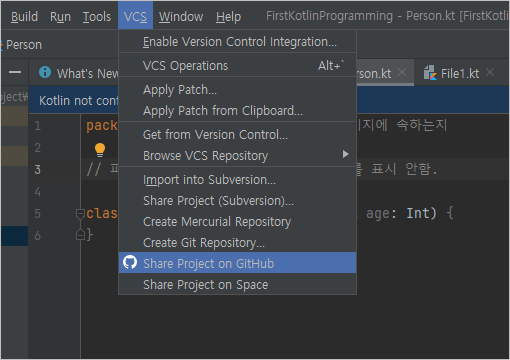 1. 코틀린 프로젝트 IntelliJ 에서 GitHub 연동하기