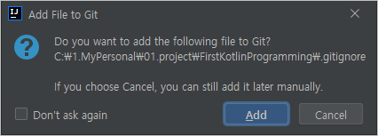 위와 같이 .gitignore 파일을 추가할 것인지 묻는 대화상자가 뜰 수 있는데 Add를 눌러 추가해주도록 합시다. 어차피 이후에 생성해야할 수도 있기 때문에 미리 만들어 두는 것도 나쁘지 않지요.