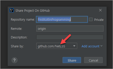 이후 Share 버튼을 누르게 되면 설정한 계정으로 해당되는 저장소가 생성되게 되는데요?