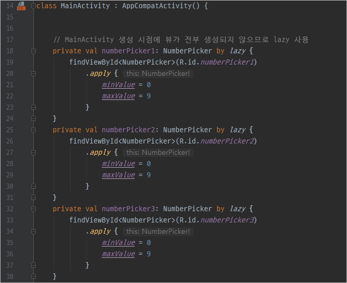 숫자 선택기를 소스코드에 연결할 때 lazy 키워드를 사용해서 게으른 초기화를 맡겨두었는데 이는 메인 엑티비티가 생성될 때 뷰가 다 생성되는 것을 보장할 수 없기 때문에 (실제로 생성 안됨) 뷰가 모두 생성되고나서 onCreate 내부에서 초기화를 할 수 있도록 lazy 키워드를 사용했습니다.