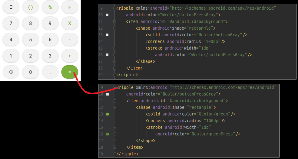 다음은 계산기 버튼을 둥글게하고 ripple 애니메이션 효과를 주는 방법입니다. drawable xml파일을 2개 생성합니다. (각각 초록버튼 하얀버튼) 그리고 ripple 태그로 감싸고 아래와 같은 코드로 추가해주시면 되겠습니다.