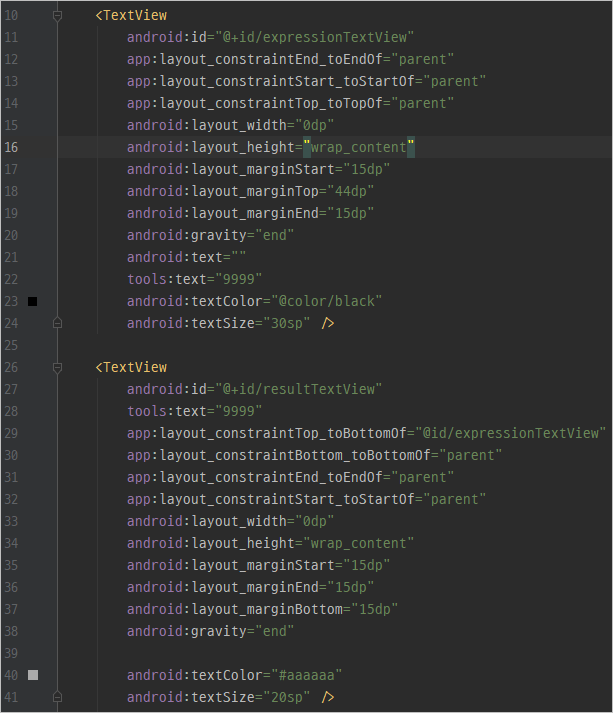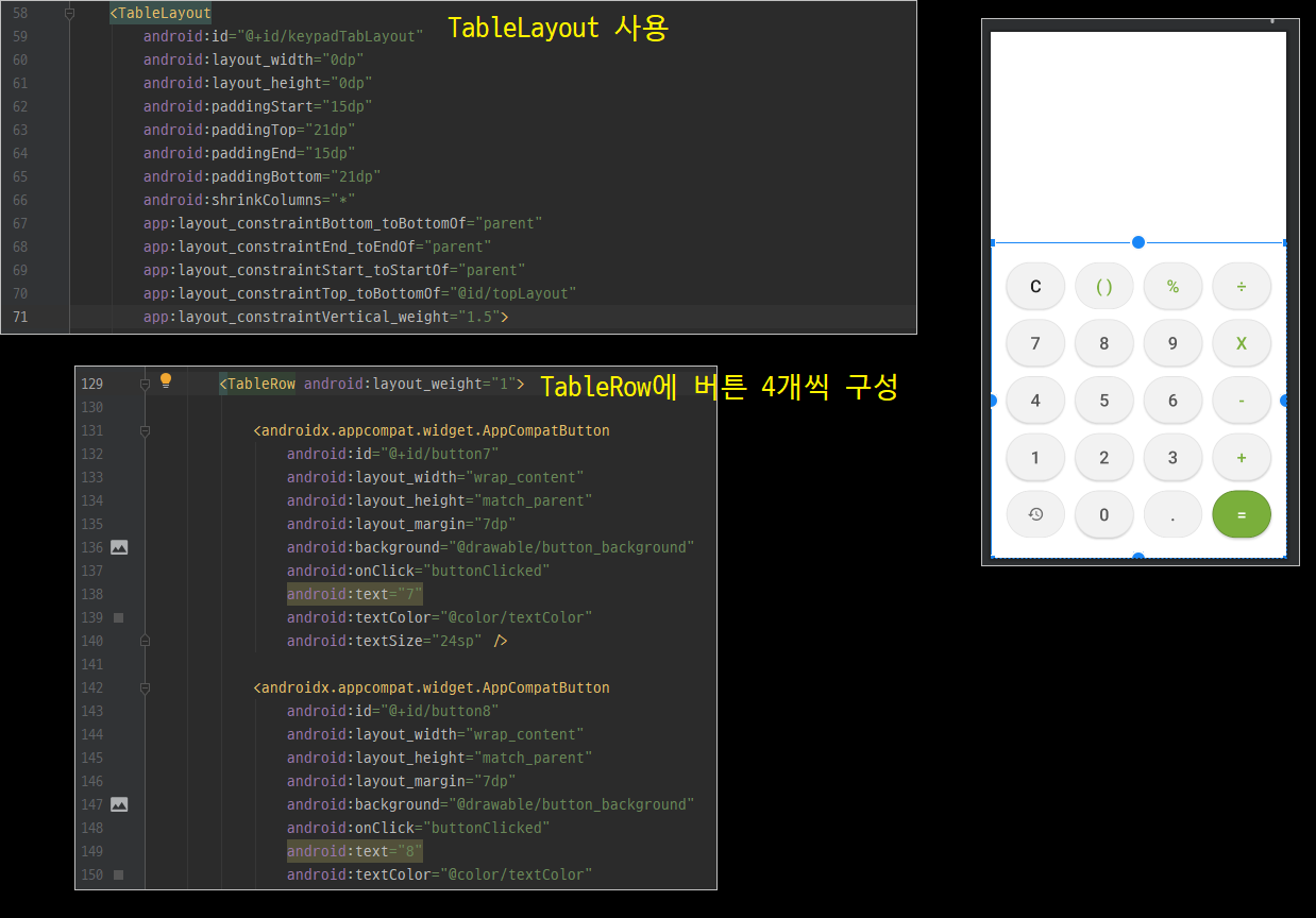우리가 보통 사용하는 계산기 어플과 마찬가지로 5행 4열로 구성한 테이블 레이아웃을 사용해서 연산자 및 숫자 그리고 기능 버튼들을 추가하였습니다.