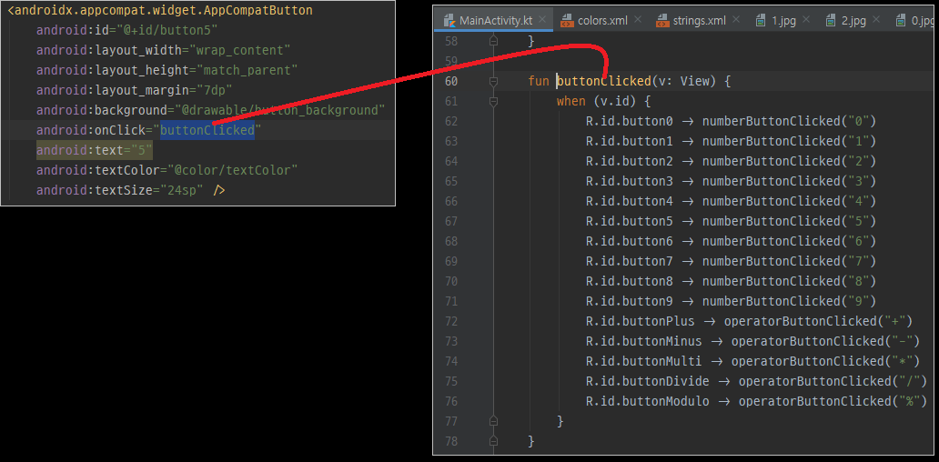 각각의 버튼에 사용된 onClick 속성으로는 모두 buttonClicked 함수를 지정해서 buttonClicked 함수 내부에서 해당 뷰의 id를 가져와서 각각에 해당하는 id에 맞는 기능을 수행하도록 when 문을 사용해서 정의해주었습니다.