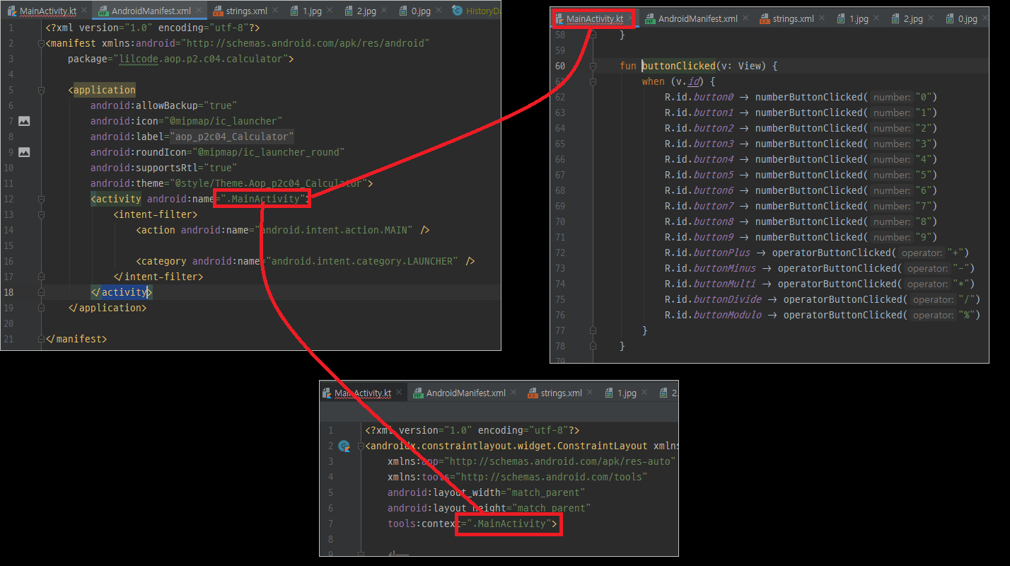 여기서 들었던 궁금증 그런데 저렇게 buttonClicked 라는 명칭만으로 어떻게 MainActivity.kt 코드에 있는 함수를 참조할까 생각해보니 아무래도 매니페스트 파일에 있는 메인 엑티비티의 name 부분에 있는 .MainActivity 라는 명칭을 가지고 참조하게 될 거란 것을 추측할 수 있었습니다.