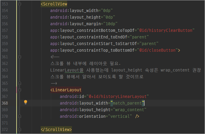 내부에는 레이아웃이 필요하며 LinearLayout을 넣어 나중에 계산 기록을 여기에 LayoutInflater로 하나하나 수직으로 쌓아주도록 설정합니다. 이때 layout_height 속성의 경우에는 wrap_content가 권장됩니다. 그래야 스크롤 뷰를 사용하느 의미가 있겠죠.