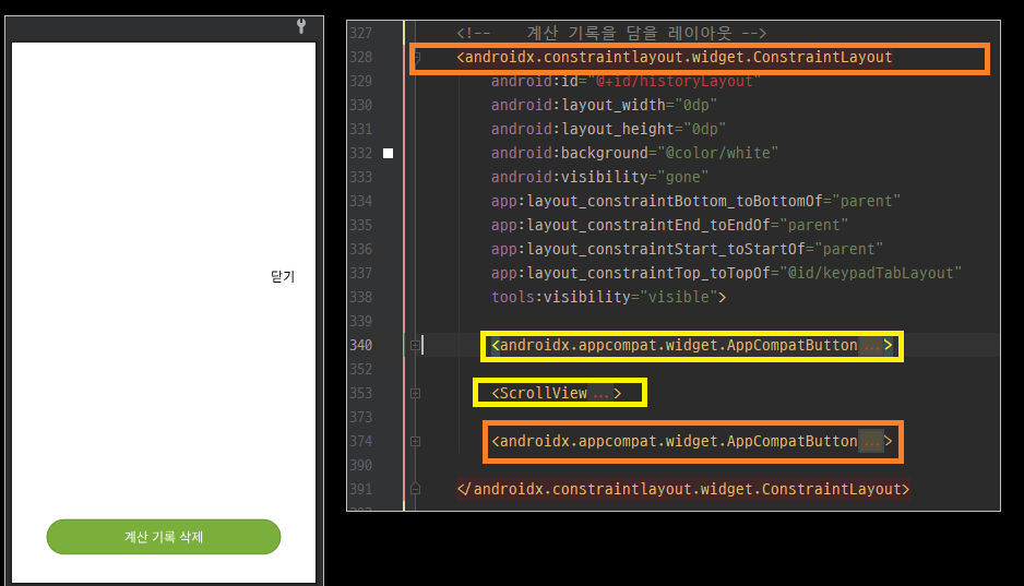 계산 기록 레이아웃은 메인 엑티비티에 ConstraintLayout을 추가해서 구성합니다. 구성 시 프리뷰에 계산기 버튼이 가려질 수 있는데 이는 코드상에서 히스토리 버튼을 누를 때 마다 해당 뷰를 띄워주고 가려주고 할 것이기 때문에 크게 신경쓰지 맙니다.