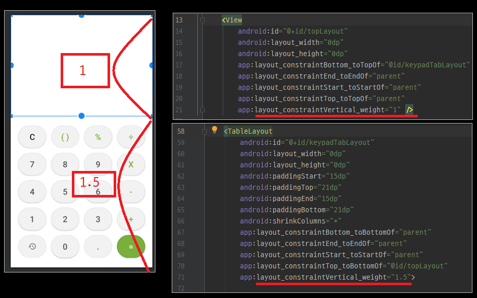보통 계산기 화면을 보면 키패드 부분의 영역이 계산식과 결과가 표시되는 영역보다 약간 큰 것을 알 수 있죠. 그래서 마찬가지로 해당 앱에서도 뷰를 일정한 비율인 1:1.5로 표시되도록 나타내주는 것이 필요했습니다.