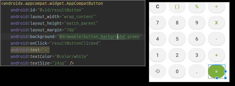 그리고 메인 엑티비티로 xml 파일로 넘어가서 background로 방금 만들어주었던 drawable 객체를 설정해주시면 되겠습니다. 아래는 초록색 버튼 백그라운드로 설정하는 코드 예시입니다. 이처럼 모든 버튼에 각각 배경을 설정해주시면됩니다.