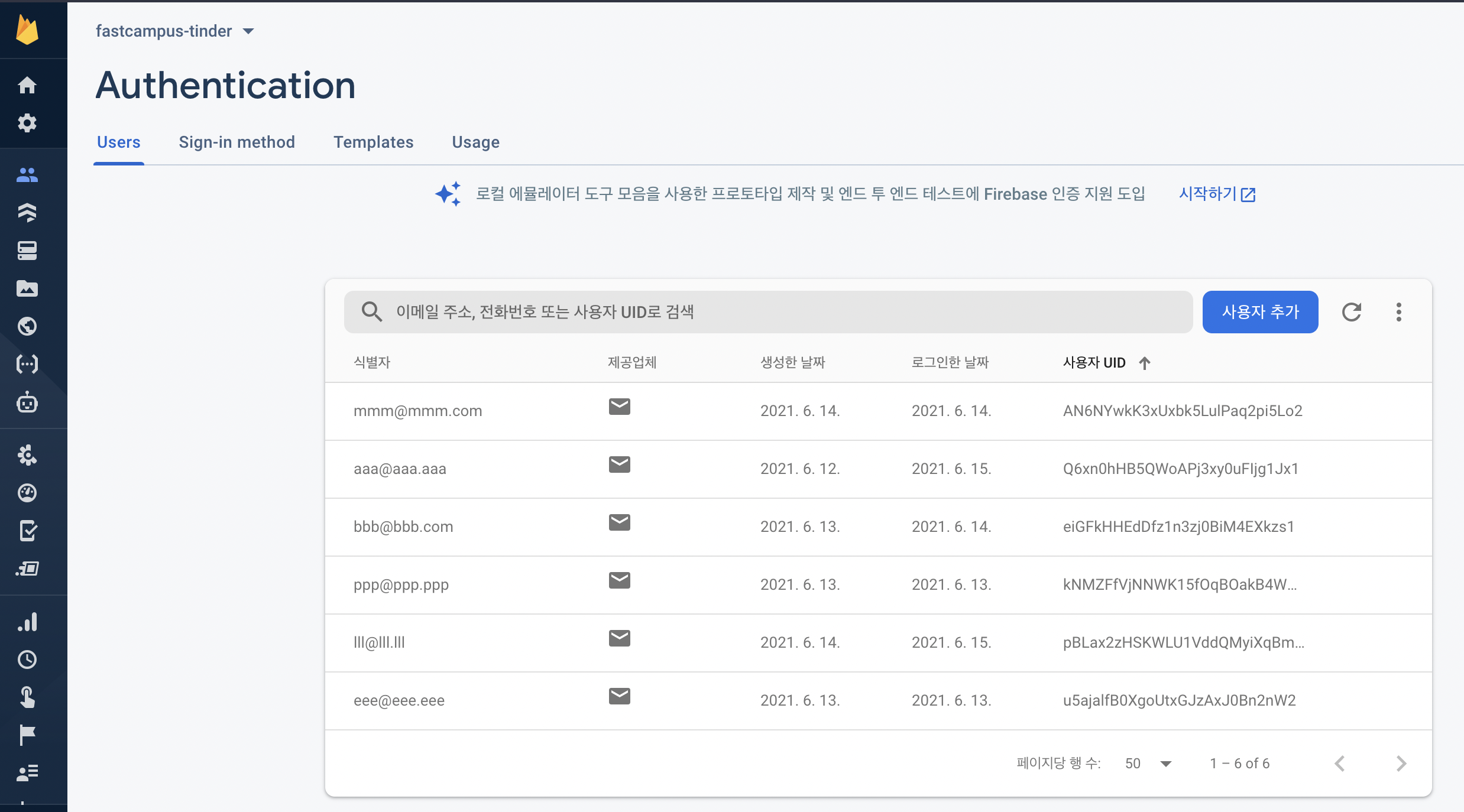 파이어 베이스 프로젝트를 하나 생성해주시고 그중 인증 서비스를 활성화 시켜줍니다. 실제로 로그인 진행시 식별자로 메일과 제공업체, 사용자 UID를 받아온 것을 아래 화면에서처럼 확인이 가능합니다.