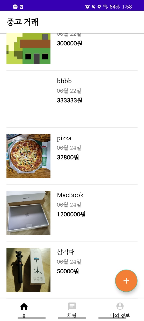 또 사용자는 중고 판매 게시글을 올릴때 플로팅 액션 버튼을 사용해서 제품 게시글을 올릴 수 있습니다.