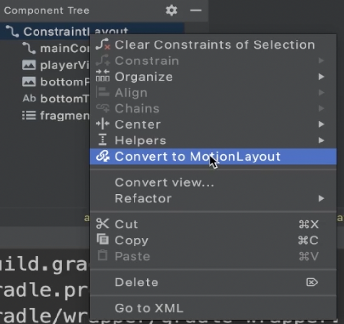 모션 레이아웃을 작성하는 방법으로는 초반에는 ConstraintLayout 기반으로 작성을 한 뒤에 Convert to MotionLayout 을 통해서 모션 레이아웃으로 변환해주면 되겠습니다.