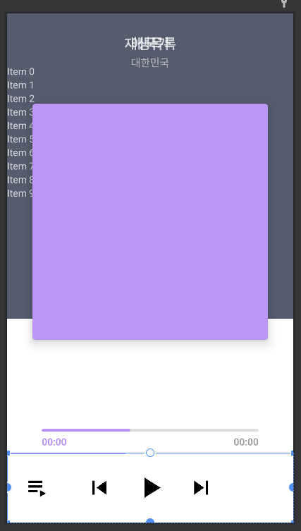 다음은 플레이어 프래그먼트입니다. 나눠진 배경의 경우 view 2개로 구성하여 위에 회색, 아래 흰색으로 layout_constraintVertical_weight 속성을 사용해 3:2 비율로 수직으로 채워지도록 설정해주어 위와 같이 만들어줍니다.