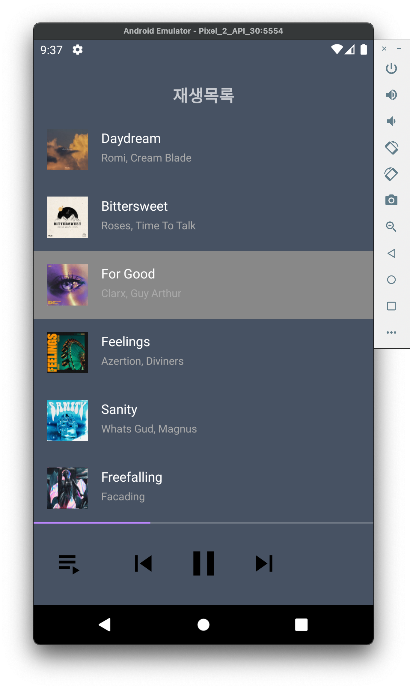 그 외로는 seekBar, 버튼(재생, 다음/이전 곡), 리사이클러 뷰에 사용될 아이템 레이아웃 등을 구현을 해주었습니다. (전체 코드는 저의 깃허브 저장소에서 확인가능합니다.)