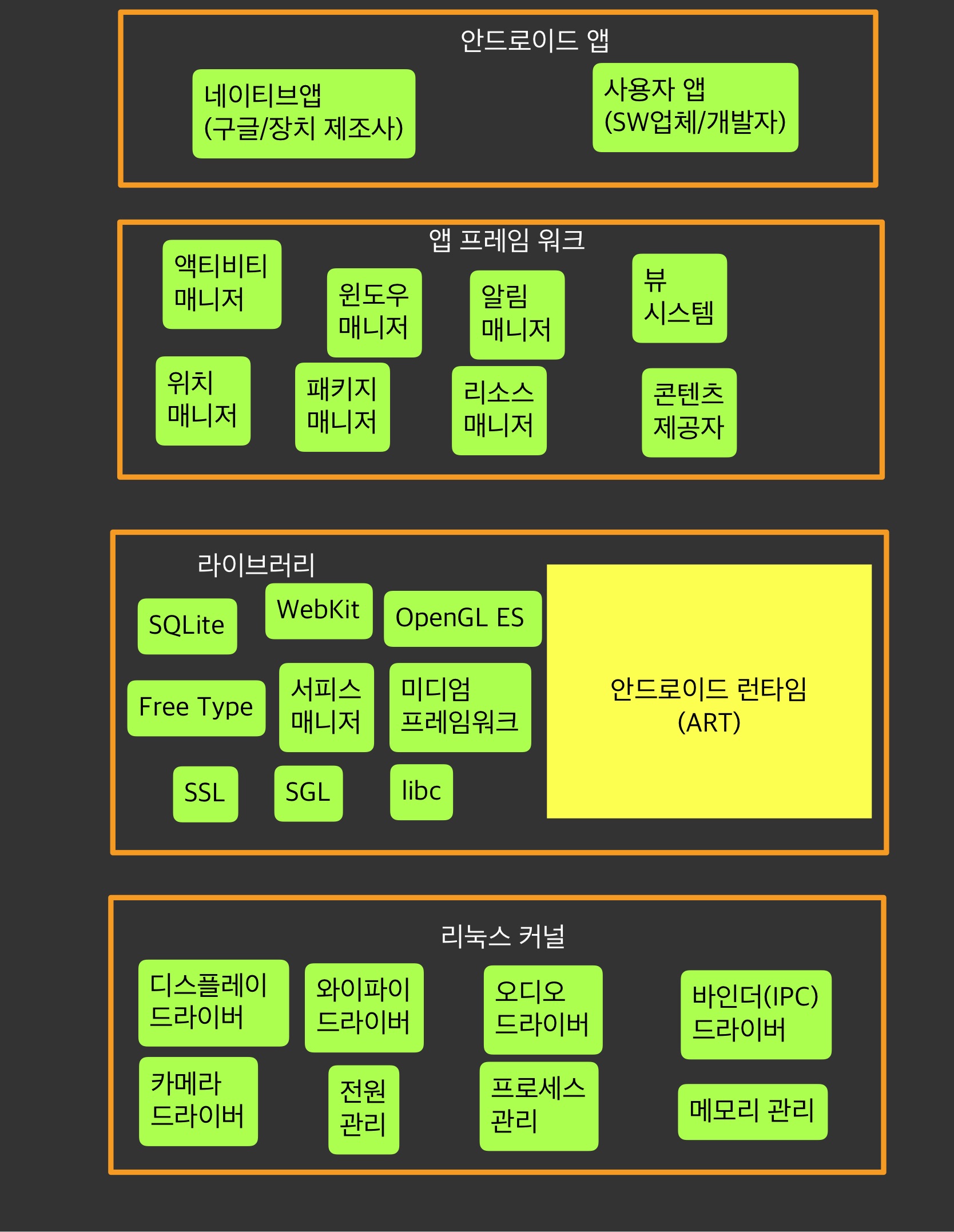- 안드로이드 앱이 실행되고 관리되는 환경을 구성하는 서비스의 집합체