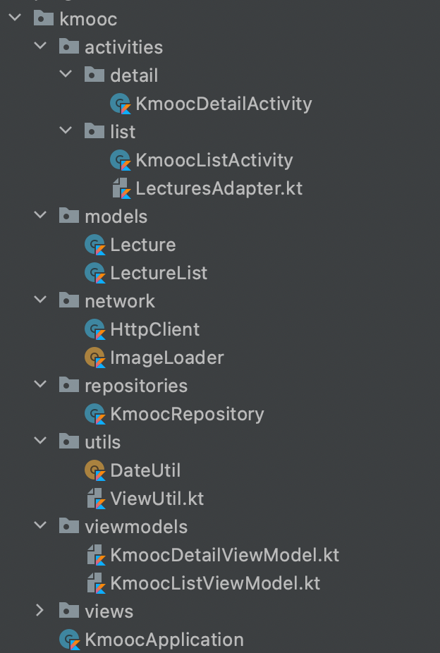 앱 매니페스트를 보면 애플리케이션은 KmoocApplication 이며, KmoocListActivity 가 런치시 기본 액티비티로 실행되는 것을 알 수 있고 KmoocDetailActivity 도 앱에서 사용되는 것을 알 수 있습니다.