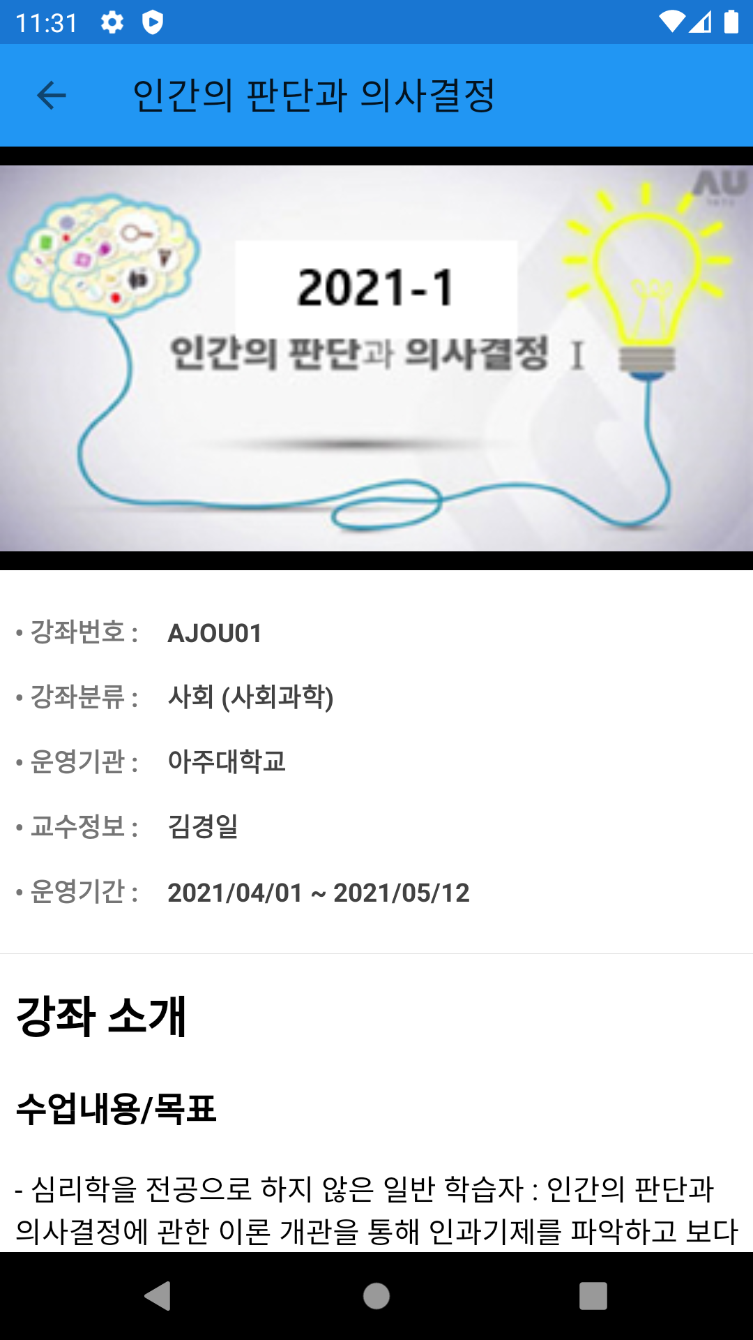 앱의 기능은 이렇게만 보면 엄청 간단한 편이다. 공공 데이터 포털에서 제공하는 K-MOOK 강좌 공개 api를 사용해서 강좌 리스트를 리사이클러뷰에 뿌리고 클릭 시 해당 강좌에 디테일한 정보와 html 을 웹뷰에 뿌려주는 형식으로 앱 구현 요구사항이 주어진다.