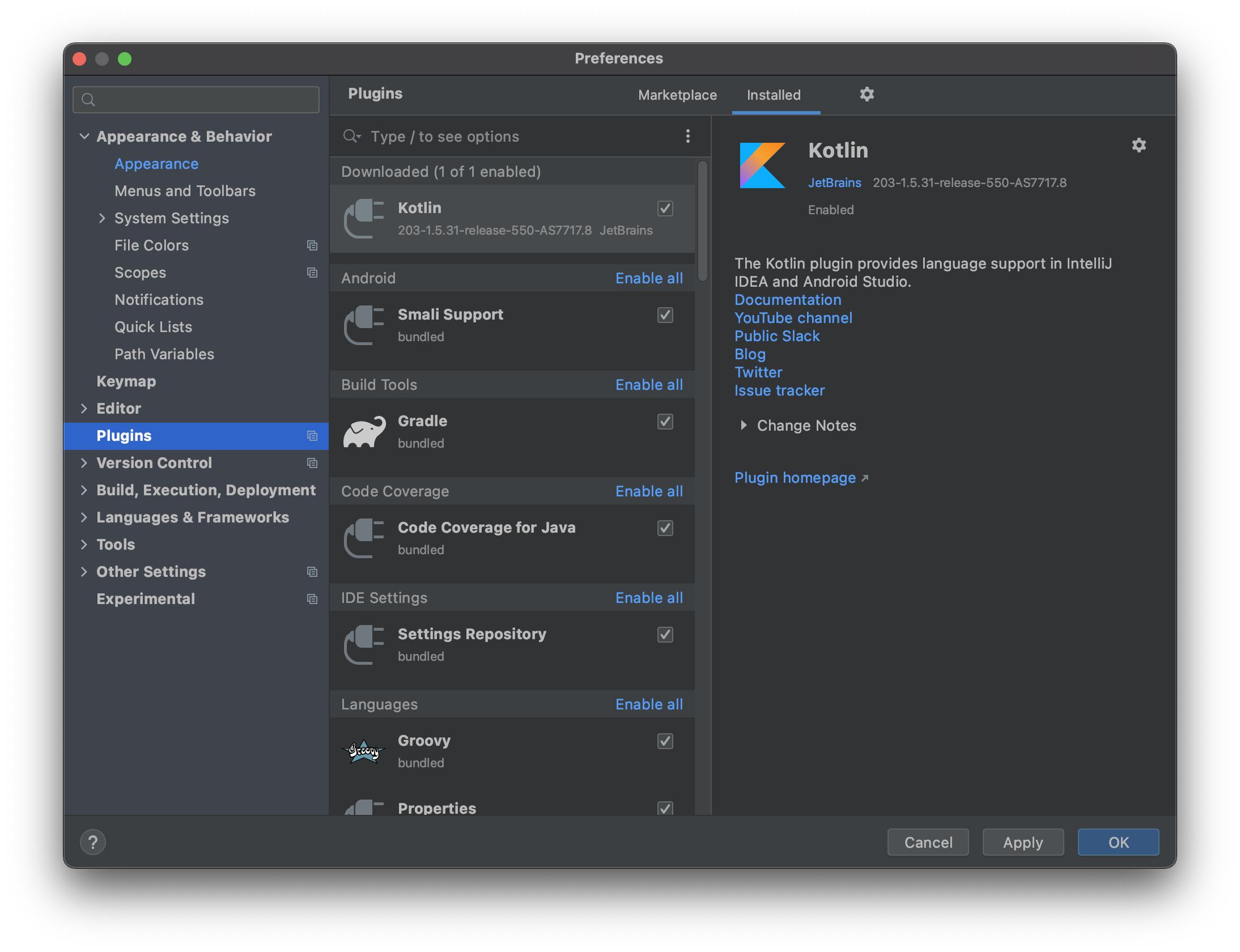 먼저 Preferences 창을 열어주세요. 이후 Plugins 탭을 선택합니다.