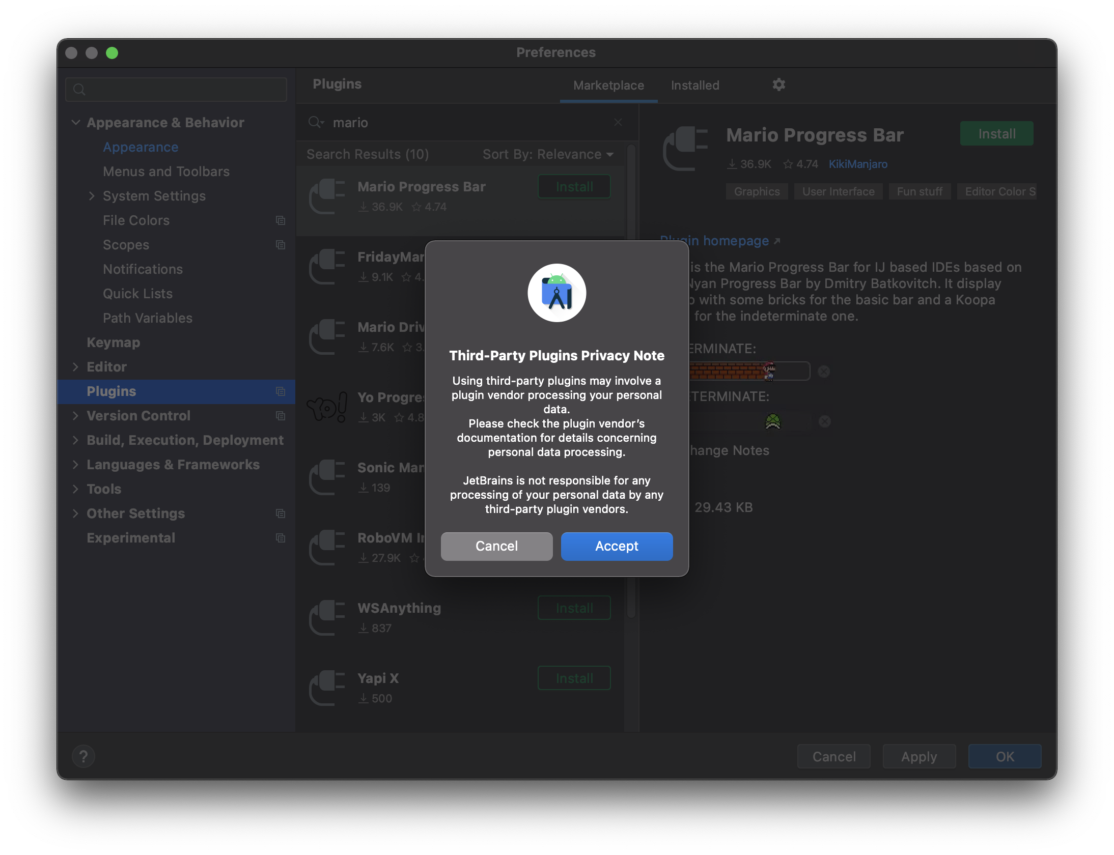 Plugins 의 Marketplace 에서 mario 로 검색해줍니다.