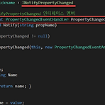 WPF - Data Binding (데이터 바인딩) INotifyPropertyChanged지금부터 설명하는(WPF)는 C#,html,sql 에 대한 기본적인 선행학습이 필요합니다. 앞서 설명한 데이터 바인딩은 사실 C#코드에서 데이터 원본을 바꿔주게 되면 UI에 업데이트가 되지 않는 문제점이있습니다. 이는 코드에서 데이터 변경시 UI에도 알림으로써 변경하도록 해주는 작업이 필요합니다. 놀랍게도 이 또한 이미 구현되어있습니다. 바로 INotifyPropertyChanged라는 인터페이스를 구현하면 되는데요? 어떻게 하면 되는건지 지금부터 살펴보도록하겠습니다. 프로퍼티변경시 알림은 위와 같이 인터페이스(interface)를 구현하면 되는데 INotifyPropertyChanged 인터페이스는 이벤트핸들러인..