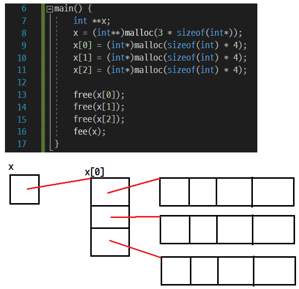 char** p = (char**)malloc(n * sizeof(char*)); // 문장 개수만큼 포인터 배열 생성